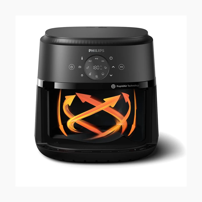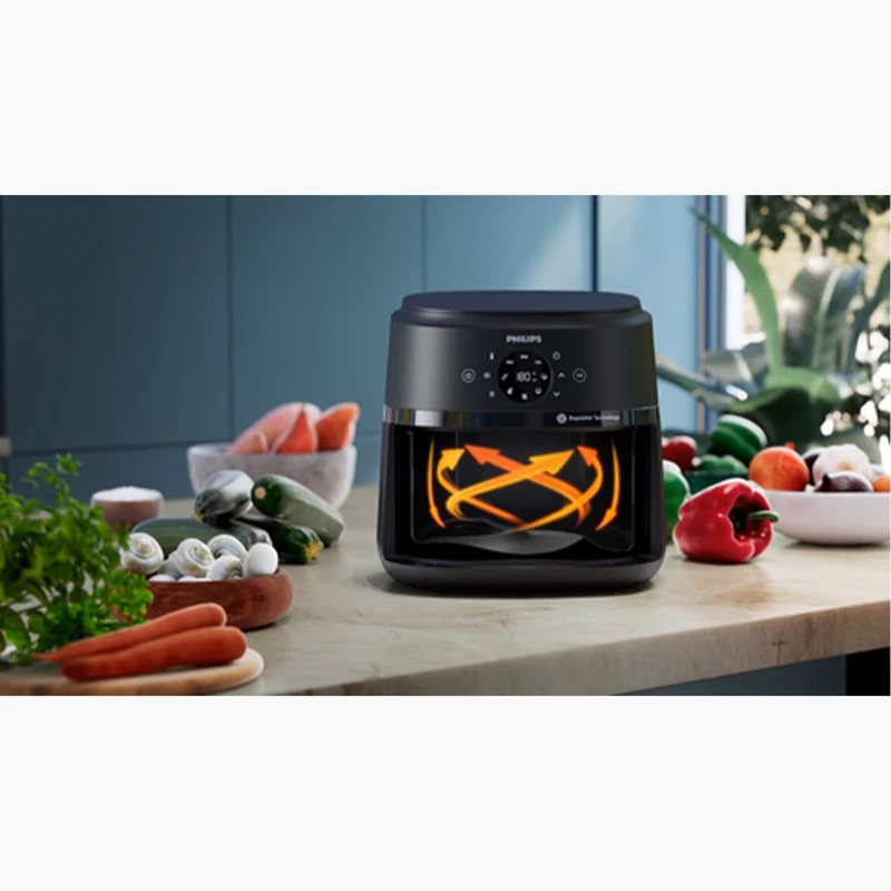 قلب تپندهی عملکرد بینظیر این سرخکن، فناوری انحصاری Rapid Air فیلیپس است. این تکنولوژی پیشرفته، با استفاده از یک المنت حرارتی قدرتمند ۱۷۰۰ واتی و یک فن با طراحی خاص که هوای داغ را با سرعت بسیار زیاد و به شکلی گردابی و ستارهای شکل در اطراف مواد غذایی به گردش درمیآورد، پختی کامل، یکنواخت و سریع را تضمین میکند. نتیجهی این گردش هوای ۳۶۰ درجه، ایجاد یک لایهی بیرونی فوقالعاده ترد و طلایی، و در عین حال، حفظ رطوبت و آبدار بودن بخش داخلی مواد غذایی است؛ آن هم با کاهش مصرف روغن تا ۹۰ درصد نسبت به روشهای سرخ کردن سنتی. نکتهی قابل توجه دیگر در این مدل، “طراحی منحصربهفرد برای پخت یکنواخت حتی بدون برگرداندن غذا” است. این طراحی هوشمندانهی داخلی سبد و جریان هوا، تضمین میکند که حرارت به طور یکسان به تمام نقاط مادهی غذایی برسد و دیگر نیازی به هم زدن یا برگرداندن مداوم غذا برای پخت یکدست نباشد. این ویژگی، راحتی و صرفهجویی در زمان را برای کاربر به همراه دارد.
