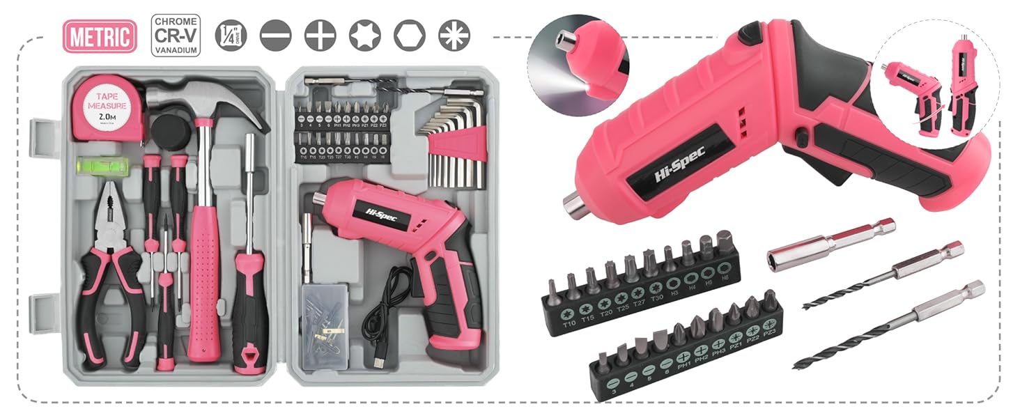 Hi-Spec 42pc Pink 4V USB Electric Power Driver & Household Tool Kit باعث صرفهجویی در زمان و انرژی میشود و شما را از پیچگوشتیهای دستی و ابزار پراکنده بینیاز میکند. ابزارها قابل شارژ با USB هستند و باتری قدرتمند ۱۳۰۰ میلیآمپر امکان استفاده طولانی مدت را فراهم میکند. با دسته چرخشی و چراغ LED، کار با این پیچگوشتی در فضاهای محدود یا کمنور راحت است.